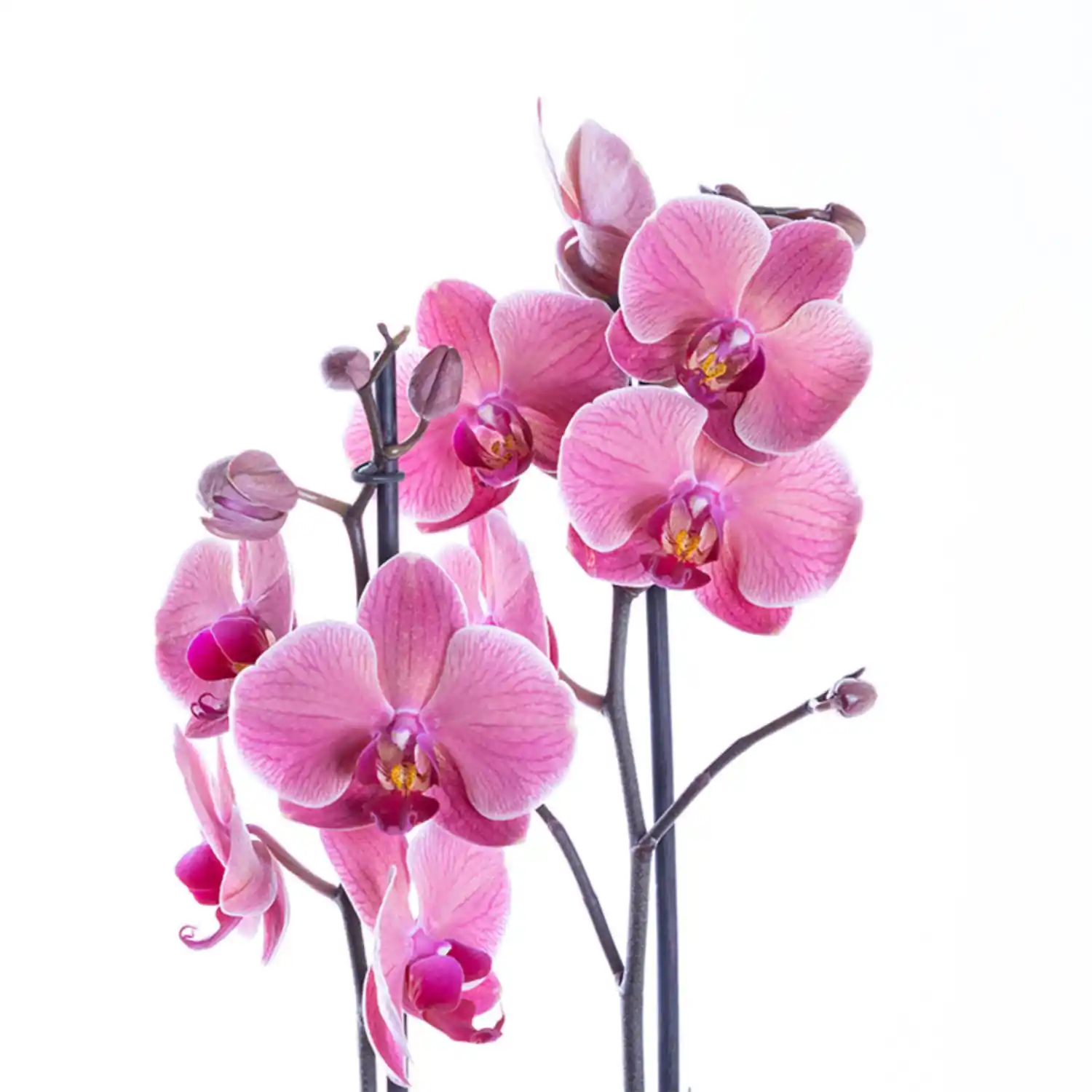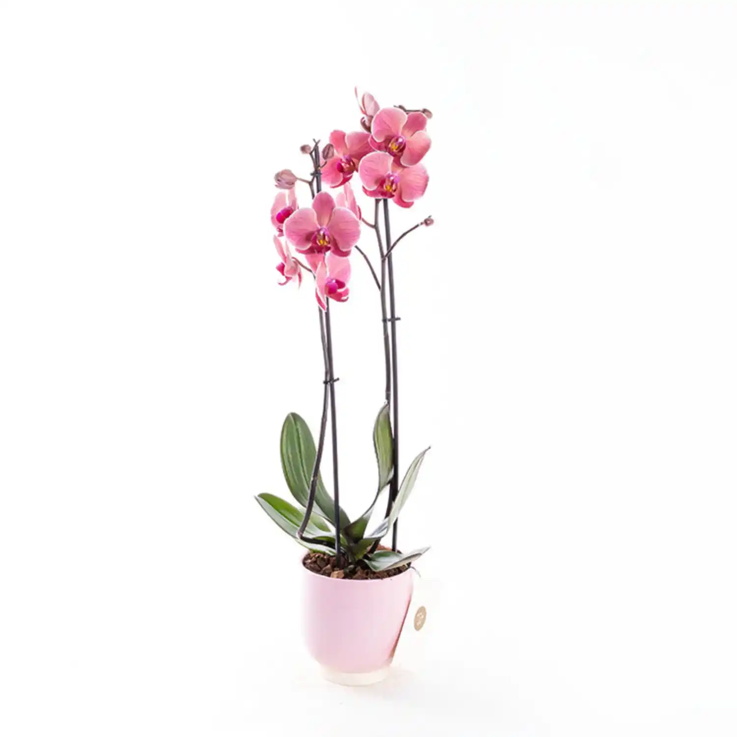 Uçuk pembe ithal seramik saksısında çift dallı Asian Coral Phalaenopsis Orkide. (Saksı Çapı: 12 cm | Yükseklik: 45-60 cm)
